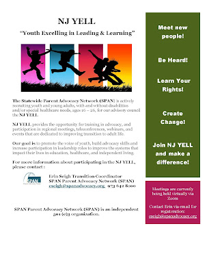 The Statewide Parent Advocacy Network (SPAN) is actively recruiting youth and young adults, with and without disabilities and/or special healthcare needs, ages 16 – 26, for our advisory council, the NJ YELL.